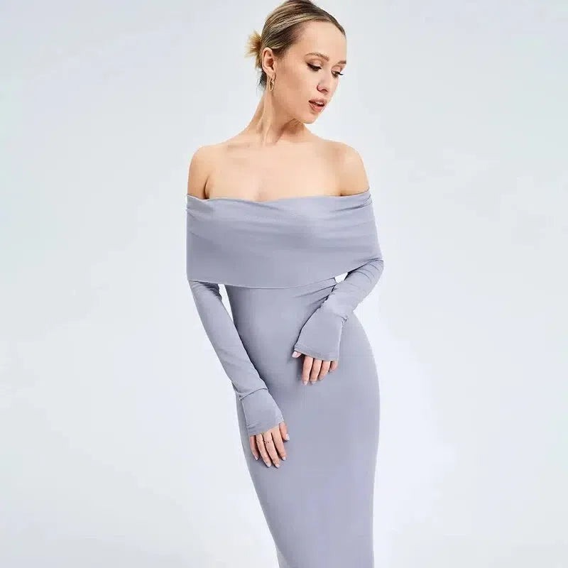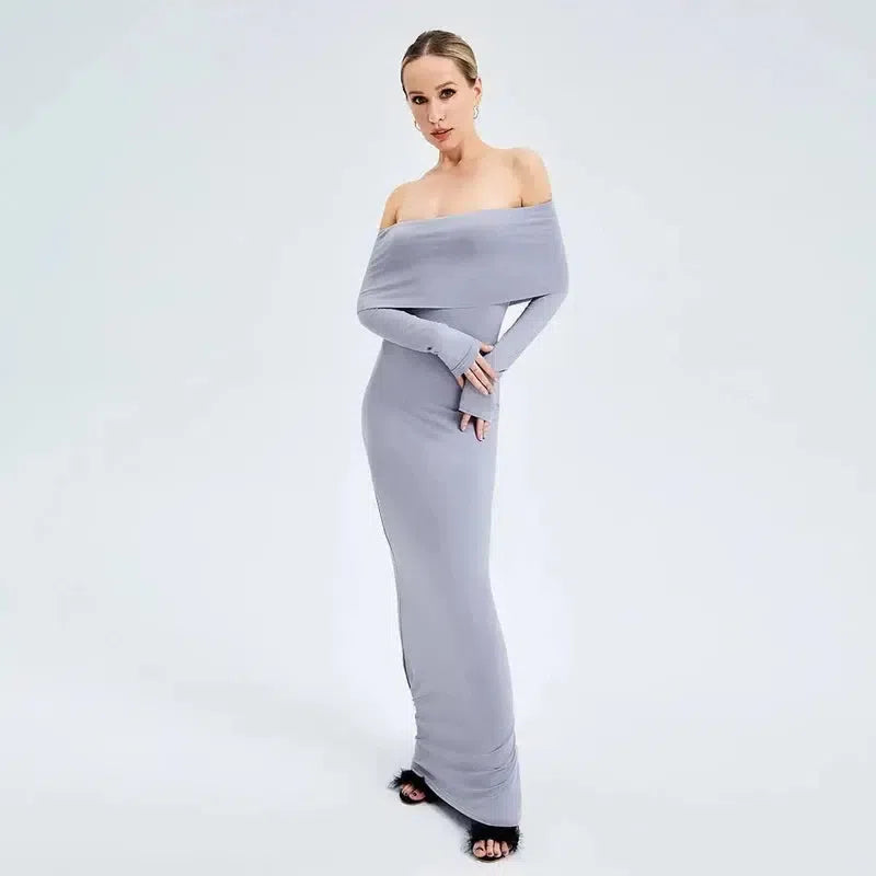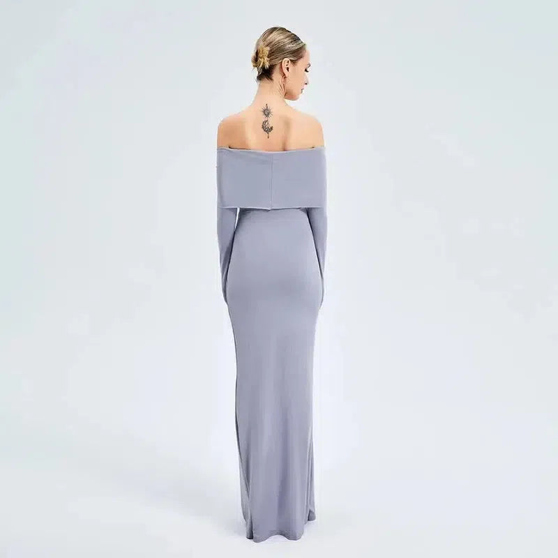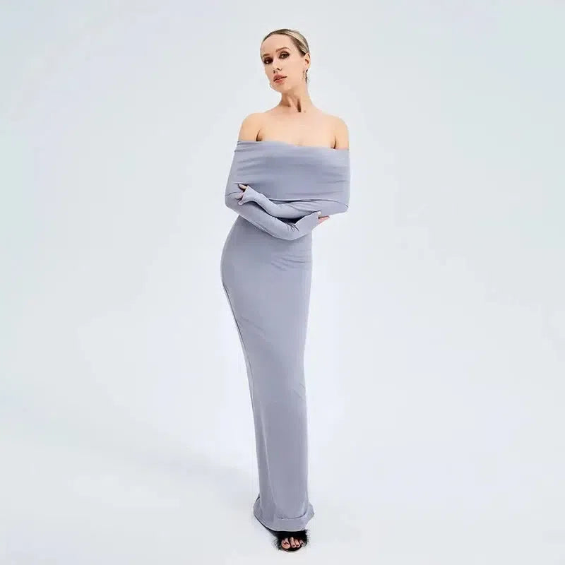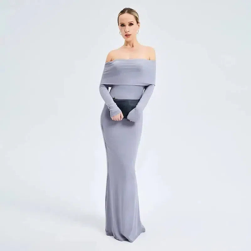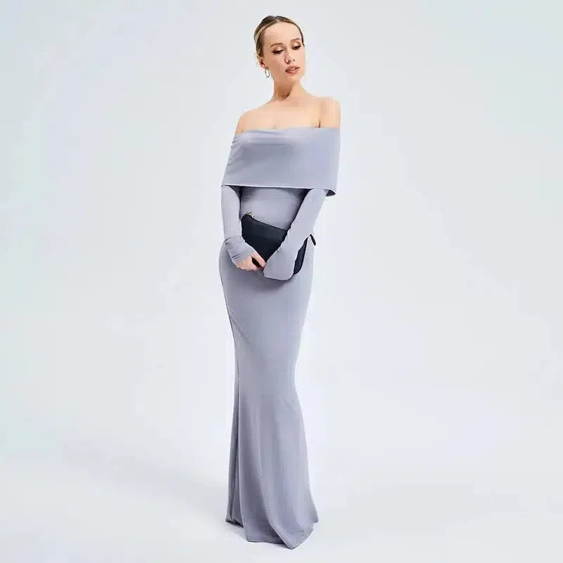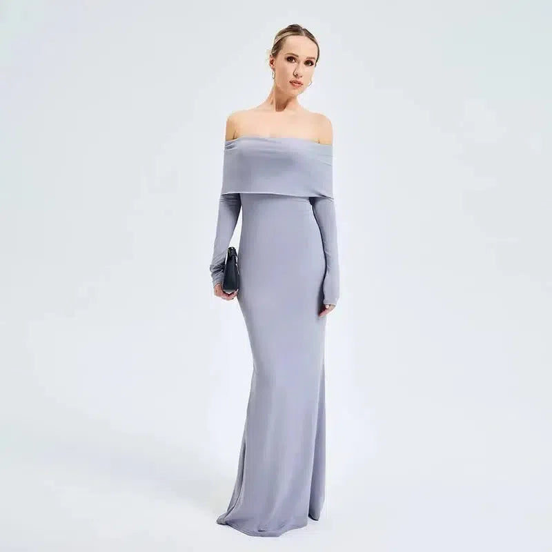 エレガントなオフショルダー長袖ロングドレス