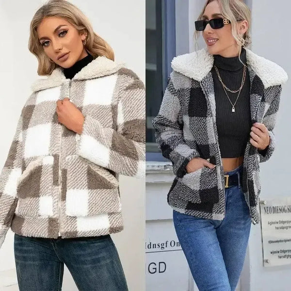 カジュアルチェックプラッシュラペルジャケットラムフリースチェックポケットトップス