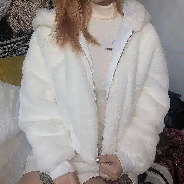 カジュアルプラッシュフード付きショートプラッシュコート レディース