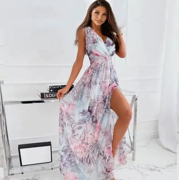 サマーシフォンプリントレースアップワンピースノースリーブレディース