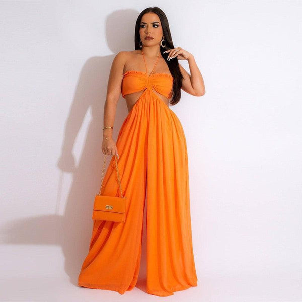 シフォン胸元ベアバックワイドレッグジャンプスーツヨーロピアン
