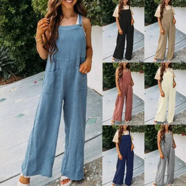 ポケット付きファッションスクエアネックジャンプスーツ春夏カジュアル無地ルーズオーバーオールレディース服