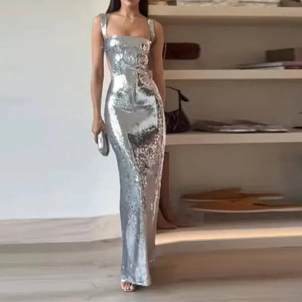スパンコールスリングスクエアカラーバックレスドレススカート
