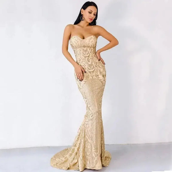 エレガントなストラップレスの幾何学模様のイブニングドレス
