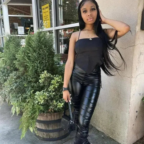 タイトプリーツハイウエストストレッチレザーパンツ
