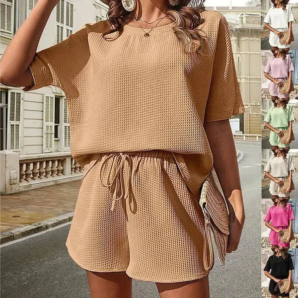 新しいワッフルスーツ女性バットスリーブ半袖クルーネックトップスとドローストリングデザインショートパンツファッションツーピースセット夏服