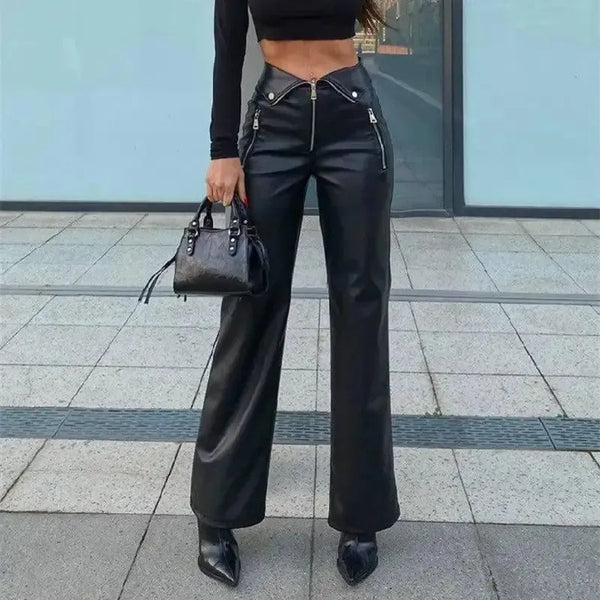 ハイウエストストレートルーズワイドレッグカジュアルパンツレザー