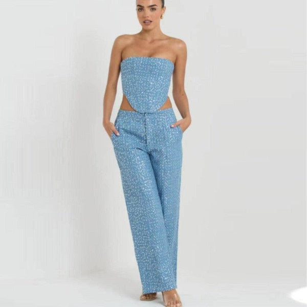 ファッション デニム スパンコール チューブトップ ワイドパンツ スーツ