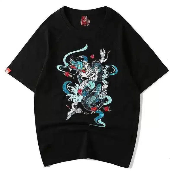 - フィット感: レギュラーフィット デザイン:デザイン: 前面に花の要素を持つ目立つドラゴンのグラフィック