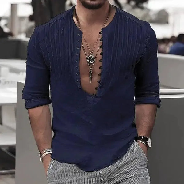 メンズカジュアルボタンコットンラウンドネックシャツ