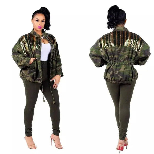 - 衣服の種類:スパンコールのディテールが施されたカモフラージュ柄のボンバージャケット