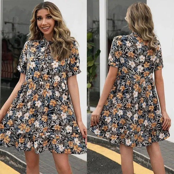 - デザイン スタンドカラー フリルディテール デザイン:パターン: 小花柄 袖丈: 半袖 シルエット: 女性らしいシルエット