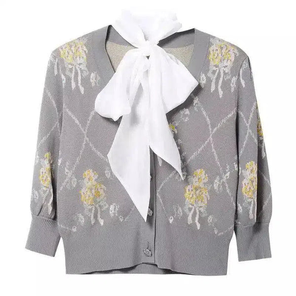 リボンタイ付きウィメンズ花柄カーディガン