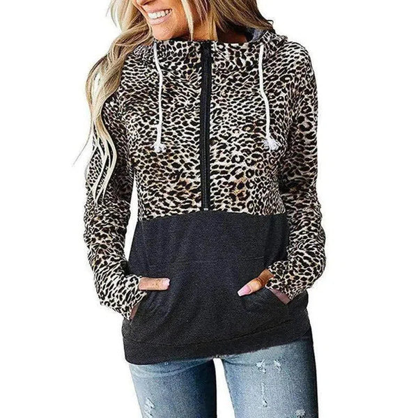 ポケット付きレオパード柄フード付きスウェットシャツ(レディース