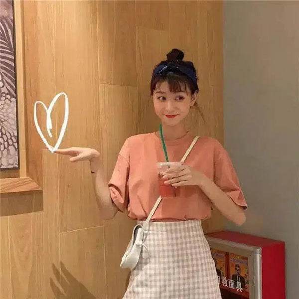 キュートでリラックスした印象を与えるカジュアルなピーチTシャツ