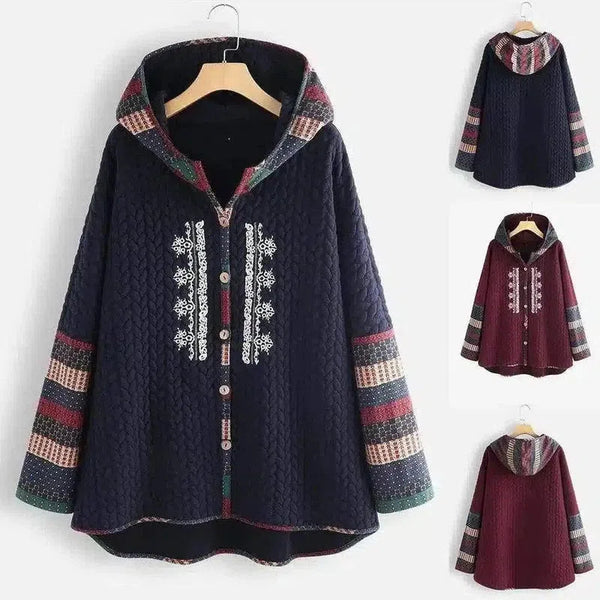 - ネックラインまたはショルダースタイル: パターン化された裏地付きのフード付き