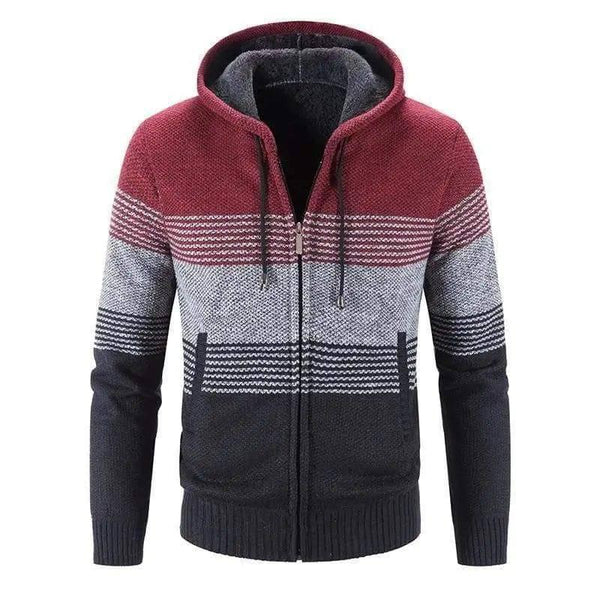 メンズフードストライプコートカーディガン男性厚手ジッパーウール