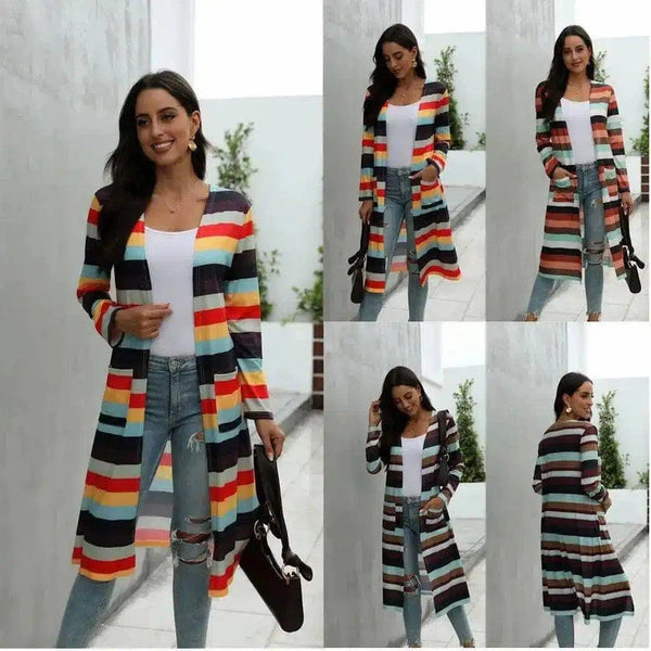 - 衣服の種類:ロングカーディガン 袖丈:長袖 ネックライン:開閉のないオープンフロント フィット:リラックスフィット デザイン デザイン:水平マルチカラーストライプ 長さ:ミッドカーフレングス