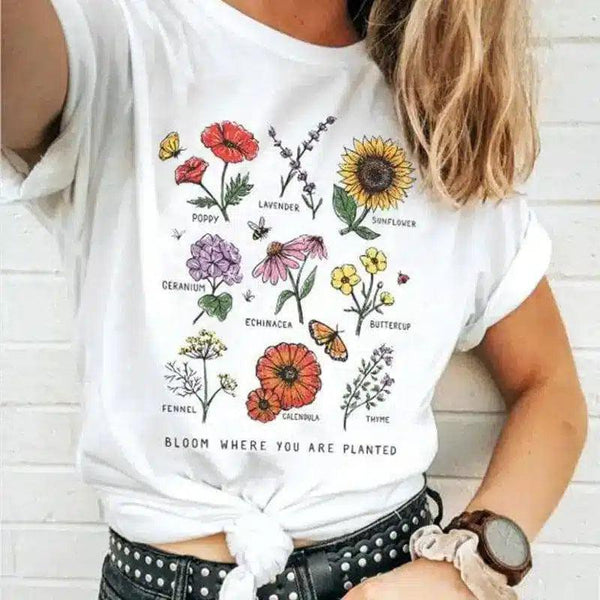 - デザイン "BLOOM WHERE YOU ARE PLANTED "の花柄プリント。