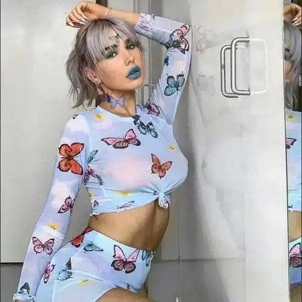 - 伸縮性があり体にフィットします デザイン:デザイン: 水色の背景に鮮やかな蝶のプリント