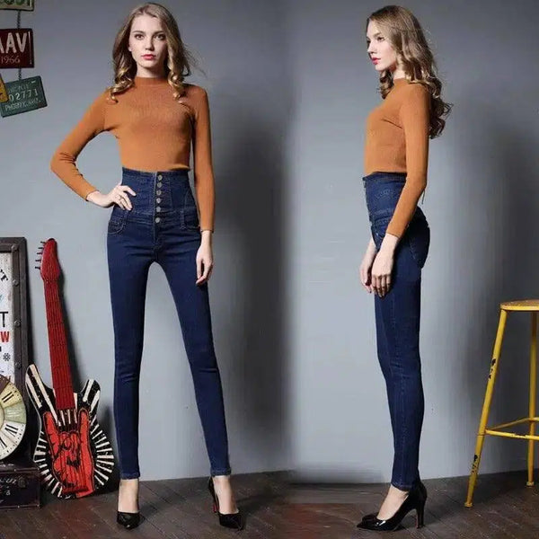 ハイウエストジーンズ女性細い弾性足ペンシルパンツ