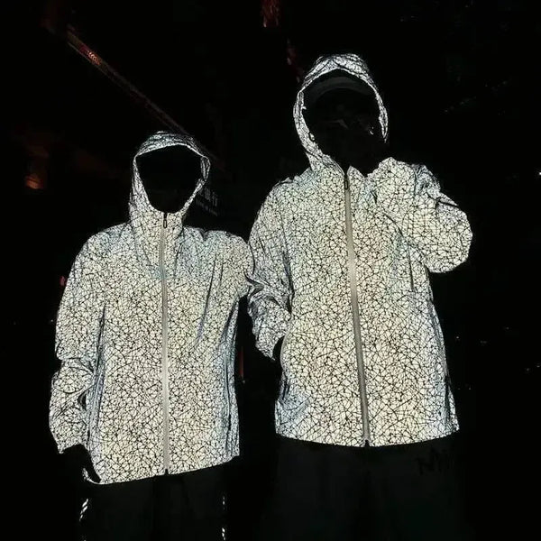 - 目を引く反射素材: これらのジャケットは、光の下で明るく輝く高視認性の反射素材で作られており、夜間の安全性と目立つストリートウェアファッションに最適です。