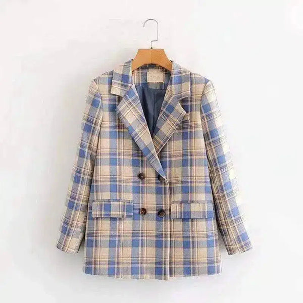 - クラシックなチェック柄ブレザー:カジュアルにもフォーマルにも使える万能アイテム。