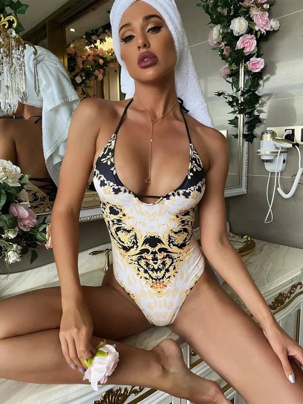 - スタイルビキニシルエットのレトロプリントワンピース水着 デザイン:ヴィンテージ風プリントでクラシックなビーチルックカバー力:フルカバレッジ、フィット感のあるカット。