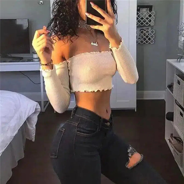 レディース・クロップド・オフショルダー・ニット・トップス