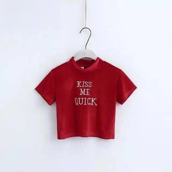 タイトな身頃と裾、高い襟、刺繍入りのTシャツ