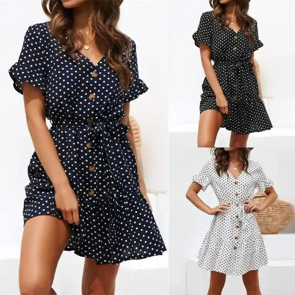 カジュアル水玉ハイライズストラップVネックシフォンレディースドレス
