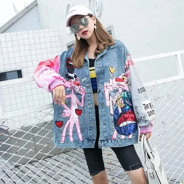 カートゥーン レオパード スパンコールプリント ステッチ ミッドレングス デニム