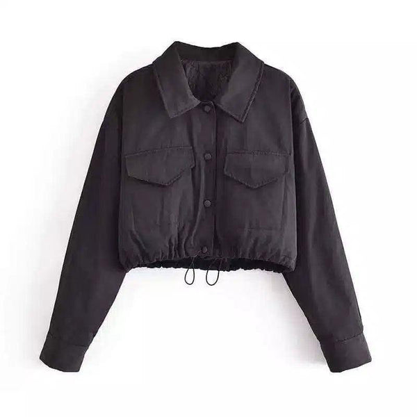 このクロップド丈のジャケットは、スタイルと快適さを兼ね備えています。