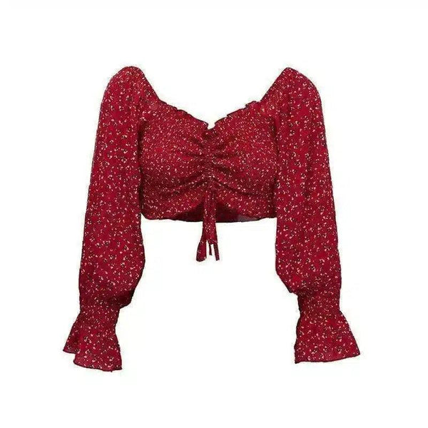- 衣服の種類:クロップトップ 袖丈:長袖 ネックライン:フロントタイ付きスウィートハートネックライン