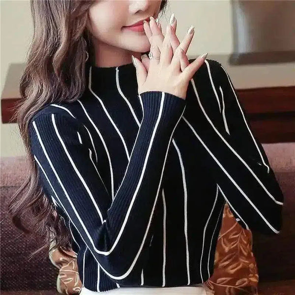 - 衣服の種類:女性用セーター 袖丈:長袖 ネックライン:モックタートルネック フィット感:ストレッチフィット デザイン:コントラストの効いた縦縞模様