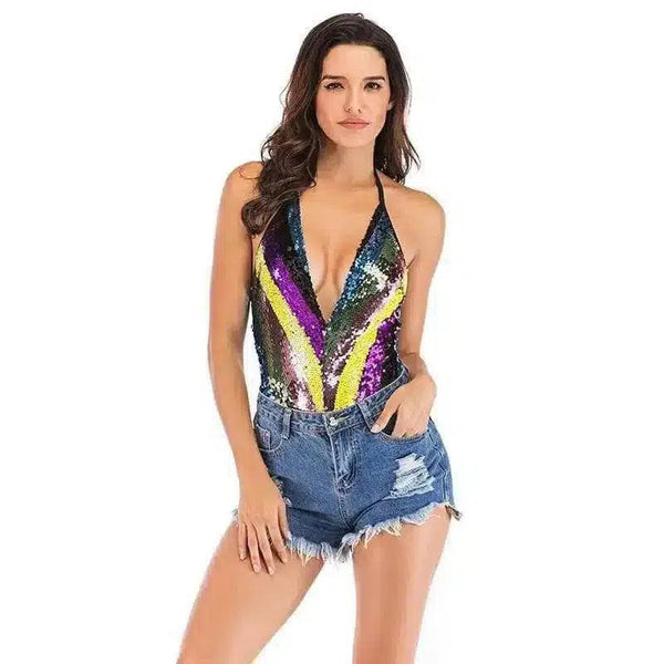 スパンコールホルターボディスーツ&リップドデニムショーツ