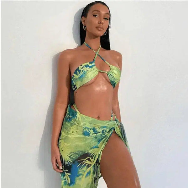 スリーピース・プリント・ラップ・チェスト・ホルターネック・ベスト・ミニスカート