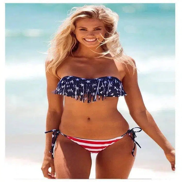 - デザイン: 目を引くタッセルフラッグプリント。 スタイル: ツーピースビキニセット