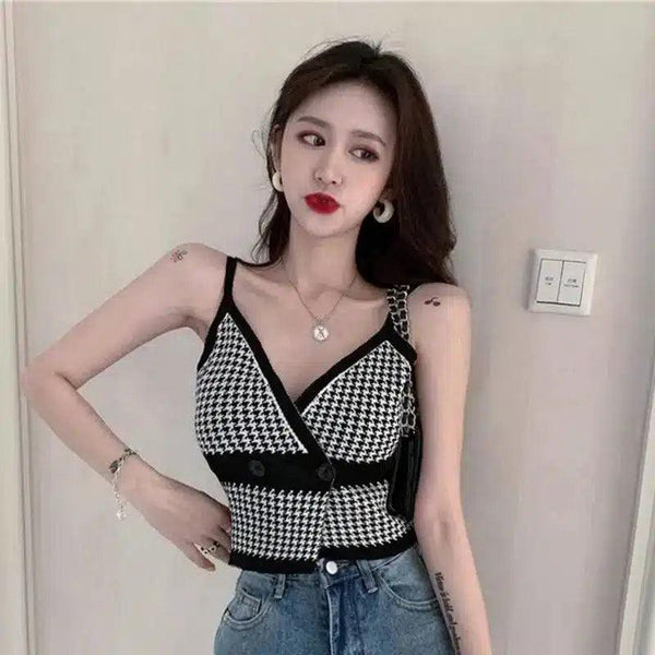 - 衣服の種類:レディースノースリーブトップス 袖丈:細いストラップのノースリーブ ネックライン:Vネックライン フィット感:フロントボタンのディテールでフィット パターン:ハウンドトゥース柄とコントラストカラーのブラックトリム