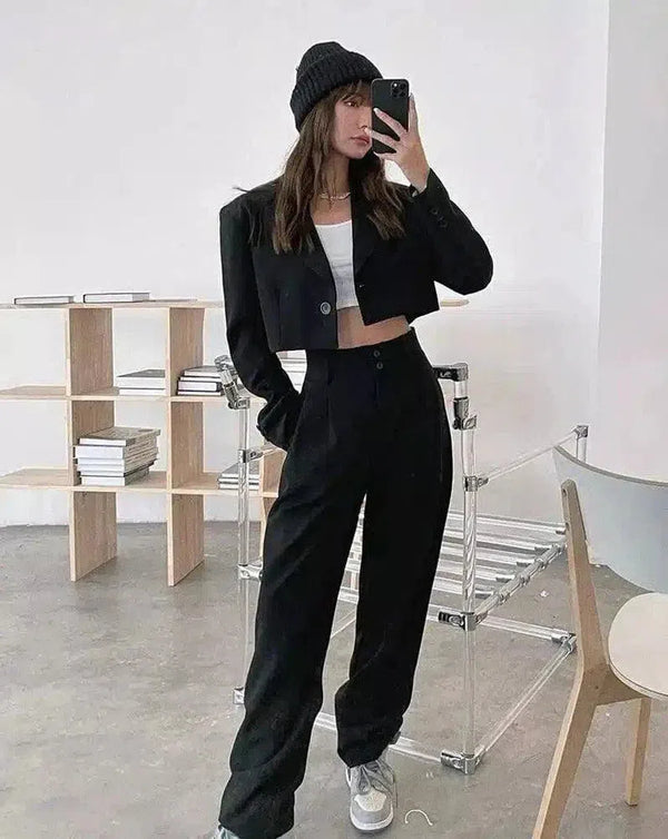 - 服のタイプ:クロップド丈のブレザーとハイウエストのパンツのツーピース・アンサンブル