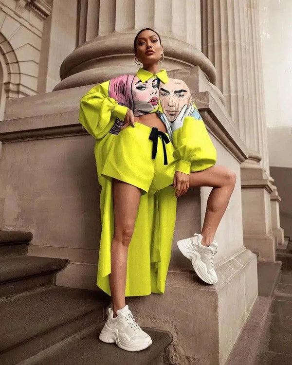 フロントポケットとタイウエストのグラフィック・パーカー・ドレス