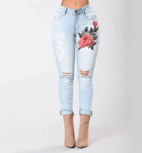ファッションホール刺繍高弾性ジーンズ女性のズボン