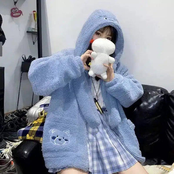 ベアラムウールコート女性冬ぬいぐるみルーズぬいぐるみ耳