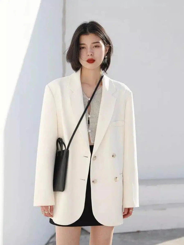 - 衣服の種類:ダブルブレストブレザー 袖丈:長袖 ネックライン/ショルダースタイル:ノッチドラペル フィット感:オーバーサイズシルエット