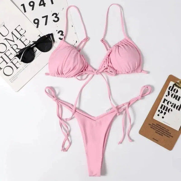 レディース水着 ソリッドカラースプリットドローストリングTバック
