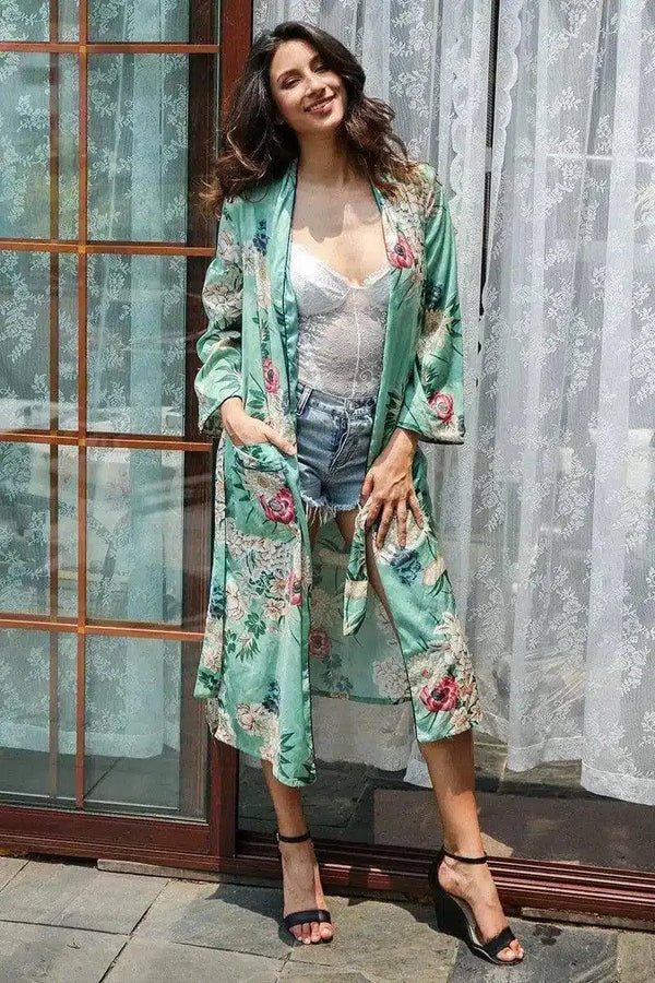 - 衣服の種類:ロングライン着物 袖丈:七分袖 ネックラインまたは肩のスタイル:開閉のないオープンフロント フィットまたはストレッチ:ストレッチなしのリラックスフィットデザインの詳細:コントラストカラーのトリミングが施されたフローラルプリントのデザイン