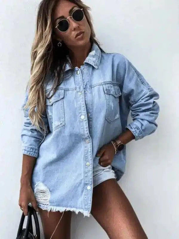 ポケット付きレディース・カジュアル・デニム・シャツ