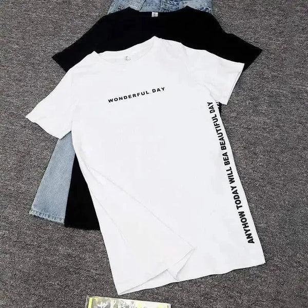 - インスピレーションを与えるメッセージ:胸にプリントされた「WONDERFUL DAY」がポジティブな雰囲気をプラスし、サイドシームに沿った長めのテキストが意外性のあるデザイン要素を提供します。