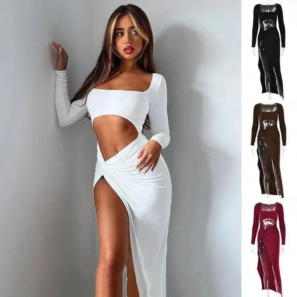 レディース服長袖ドレスファッション中空Uネックスプリットドレスパーティウェディング