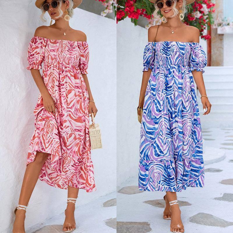 - スタイル:レディースオフショルダープリントワンピース デザイン: フィットしたシルエットのスモッキングディテール